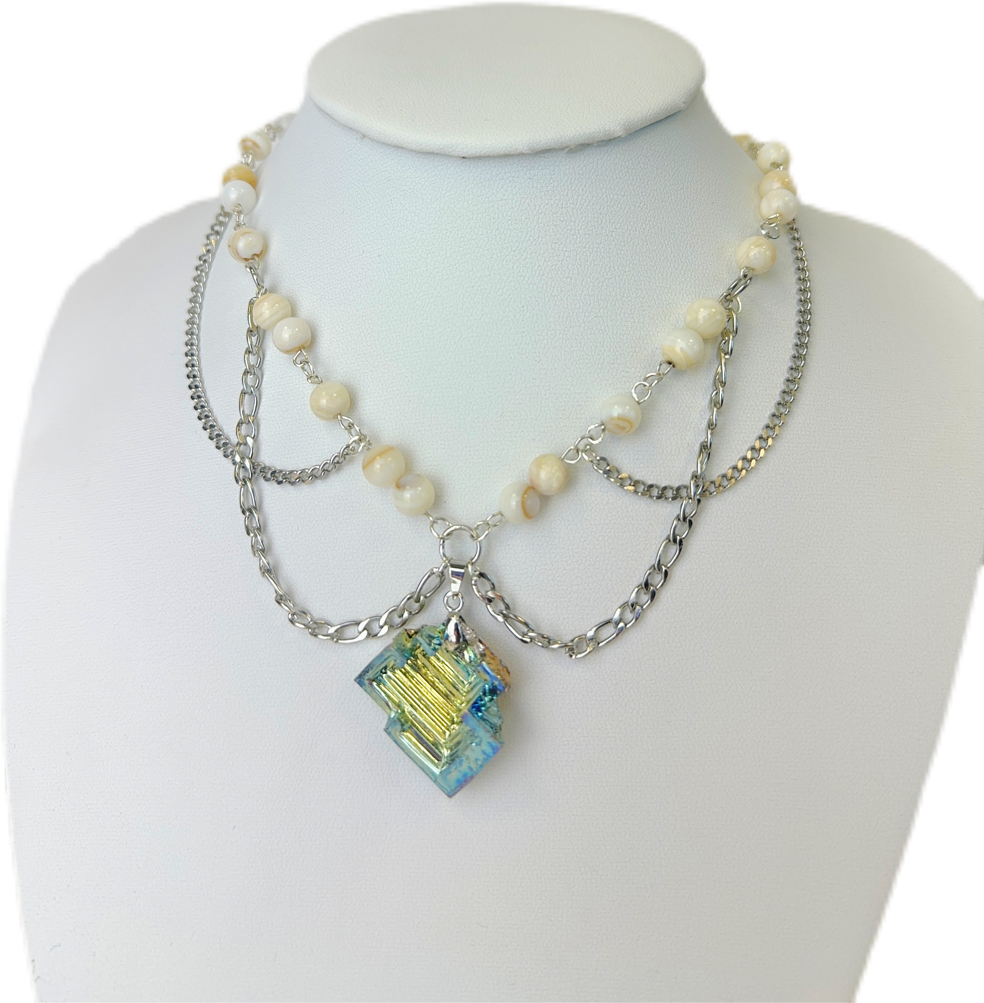 Twój styl zasługuje na unikatowe akcenty, a nasz naszyjnik to perfekcyjne połączenie luksusu i natury. Wykonany z niezwykłego kryształu bizmutu, słodkowodnych pereł i trwałych elementów ze stali nierdzewnej, ten naszyjnik emanuje elegancją i wyjątkowością, doskonale odzwierciedlając Twoją osobowość.